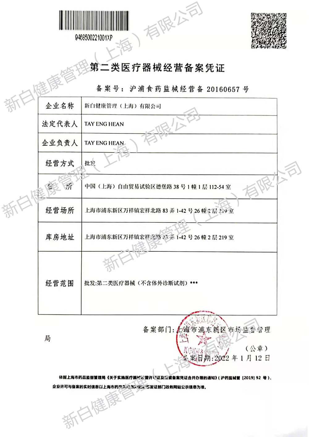 - 二類醫療器械經營備案號:滬浦食藥監械經營備20160657號